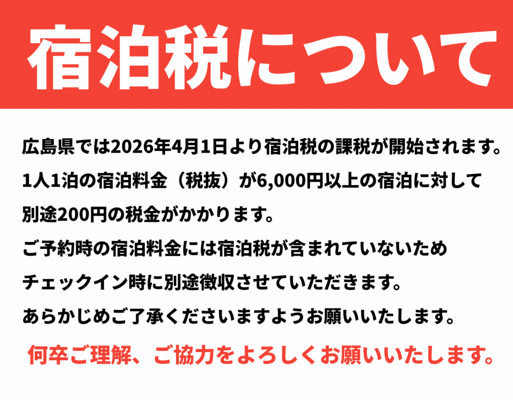 お知らせ広島県では2026年4月1日より宿泊税の課税が開始されます。